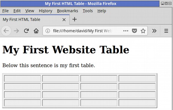 There is a mistake in the above code in that the table opening and closing tags are listed twice. Delete the red table tag and the closing table tag just to the left of it. Then save the file and open the browser. Clear your browser history and reload the page. Here is what our table now looks like in the browser: