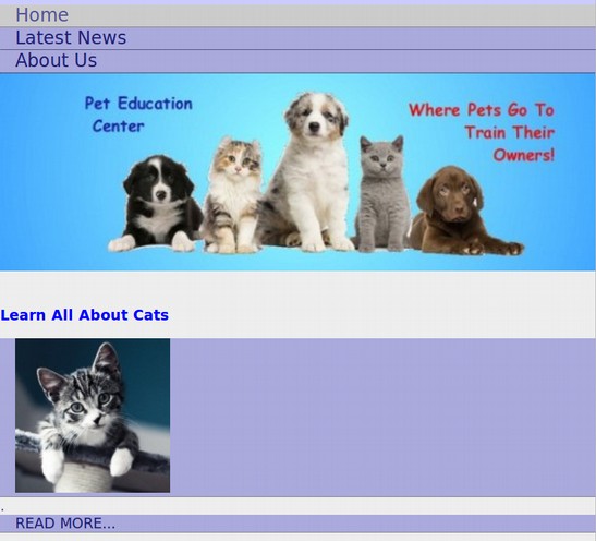 In the index.html file, in each column, replace the Category with text such as Learn All About Cats. Link 1 will be replaced by a a linkable image of the pet using <img src=”” alt=””> . Link 2 will be replaced with a READ MORE button linking to the page about that category of pets. Link 3 will be deleted.