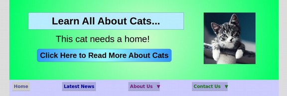Save this image to our Writer Pet Education Header document. Then right click on it and click Compress. Then save the image in our images folder as header3.jpg. Then open the image with Pix and resize it to 2000 pixels. Crop it and save it as header3_2000.jpg. Then in our HTML, change the background image url from 2 to 3. Also change the target URL from index.html to cats.html. Then save the file and view in your browser: